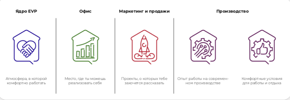 EVP (ценностное предложение работодателя) — чёткое представление сильных сторон компании, учитывая мнение сотрудников, видение руководства и потребности целевых аудиторий соискателей;