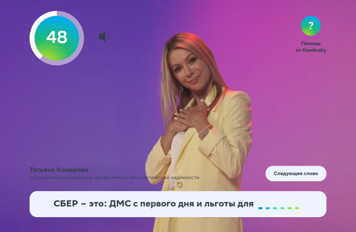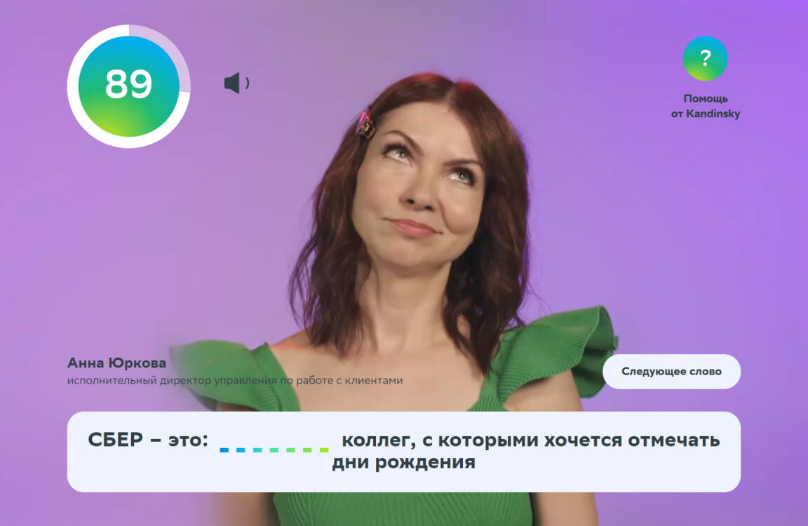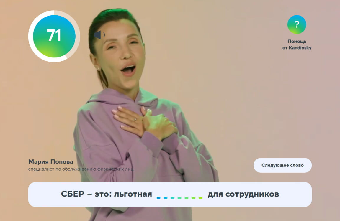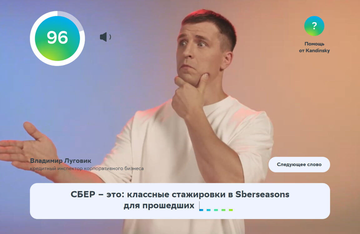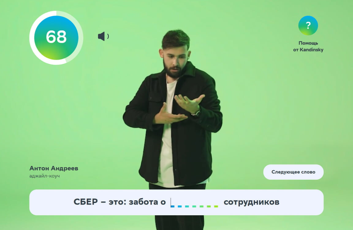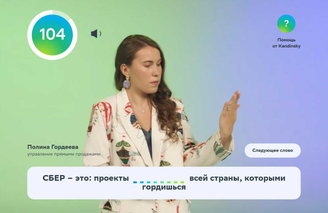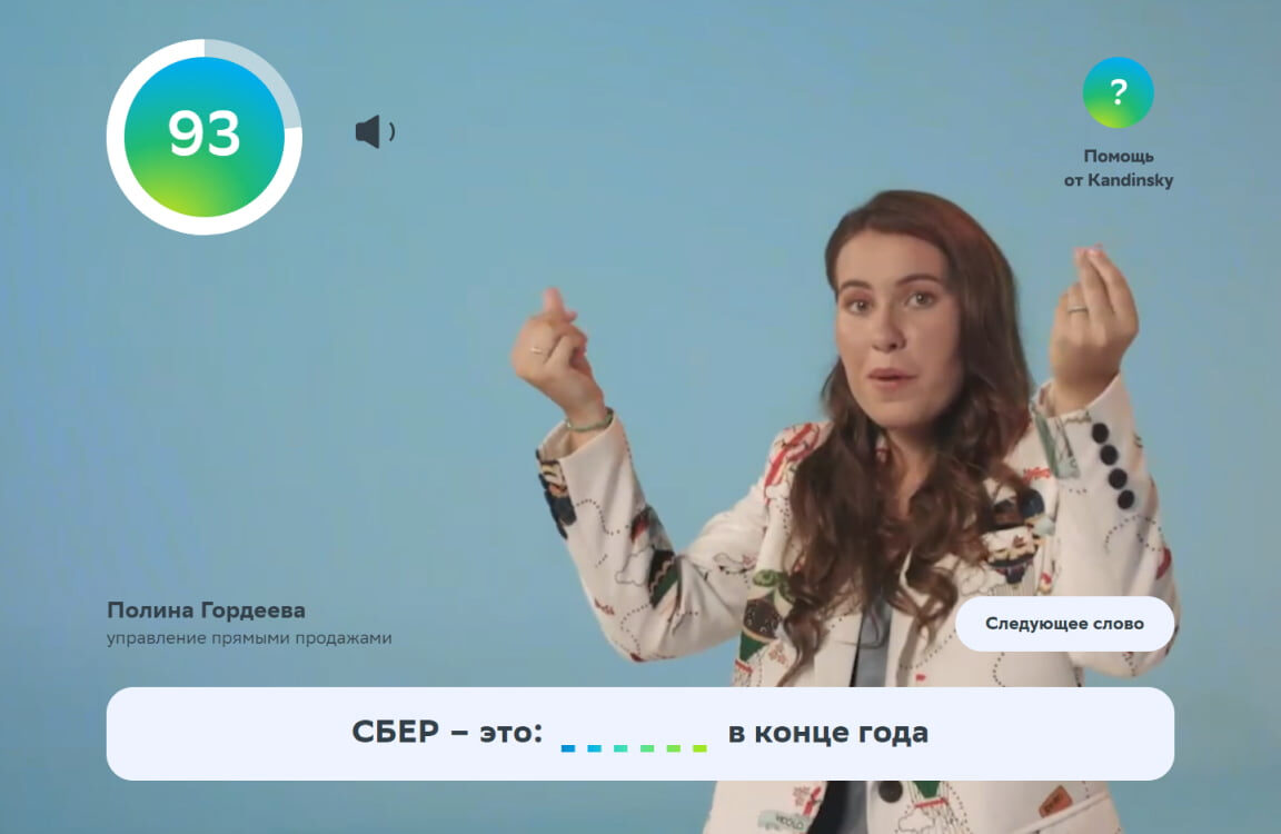 • Задача игроков — посмотреть видеоролик и догадаться, что изображает человек по ту сторону экрана. Пропущенные слова необходимо вставить в предложения, каждое из которых начинается со слов: «Сбер — это…».