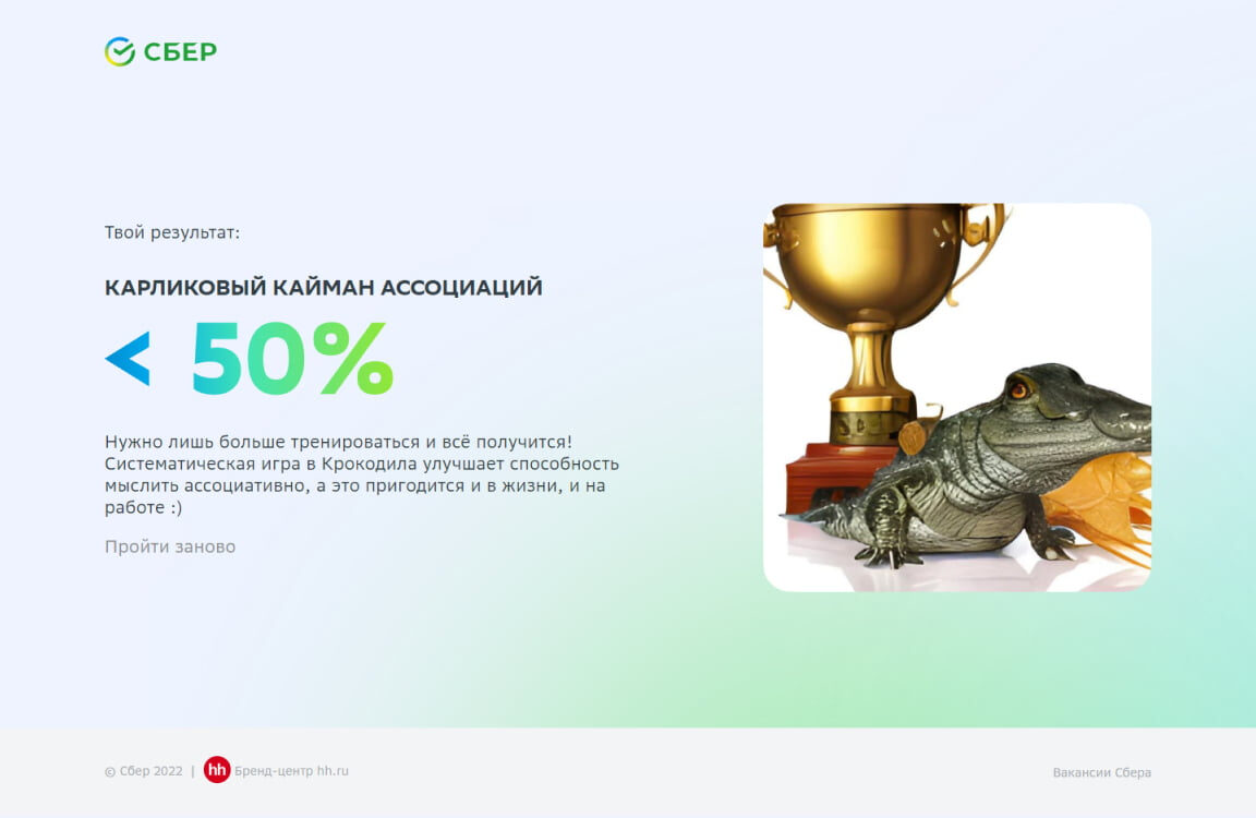 Это пятый спецпроект «Сбера» и Бренд-центра hh.ru. Сначала разрушали мифы, затем строили новый образ «Сбера». Третий спецпроект — «Вперёд в будущее» — сыграл на опережение и показал, какие профессии будущего нужны уже сегодня. В прошлом году компания пошла ещё дальше и сделала ставку на атмосферу драйва и поддержки в командах. Так появилась «СберИнтуиция». А что дальше? В контексте событий 2022 года решили дать соискателям опору и островок стабильности и предложили поиграть в «Крокодила».