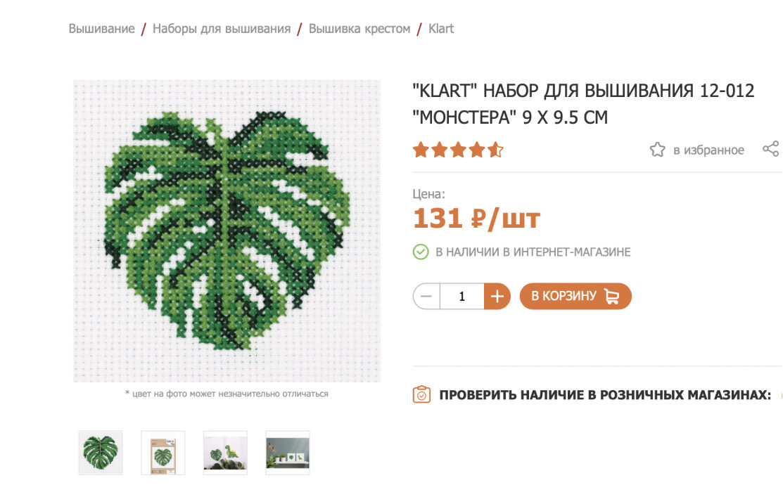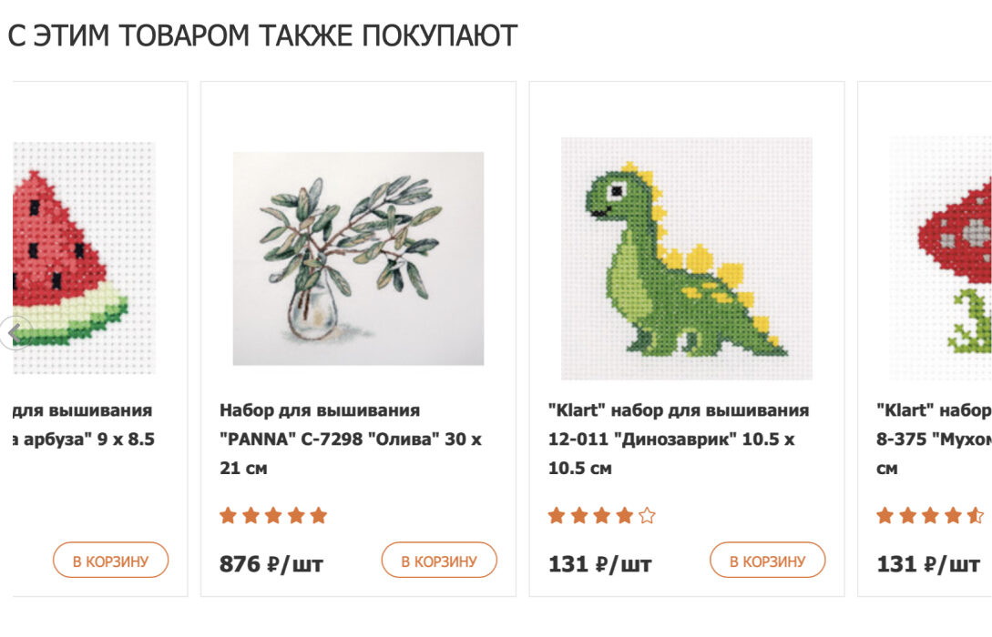 Социальное доказательство и показ товаров, которые покупают с выбранным другие пользователи. Пример из интернет-магазина для хобби. К набору для вышивания предлагают дополнительные варианты.