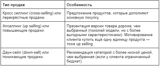 Выявление потребностей в дополнительной покупке. Обычно здесь в работу включается менеджер, который задаёт вопросы клиенту. Другой способ рекомендовать товары — использовать данные предыдущих покупок и действий клиента на сайте.
