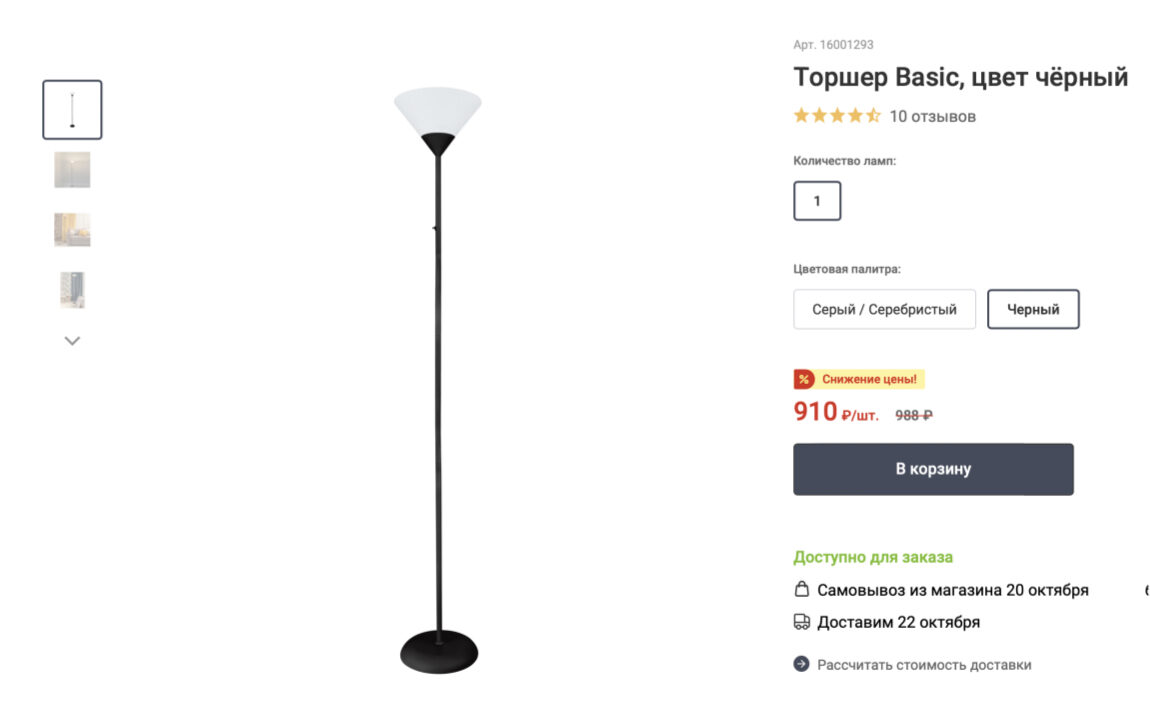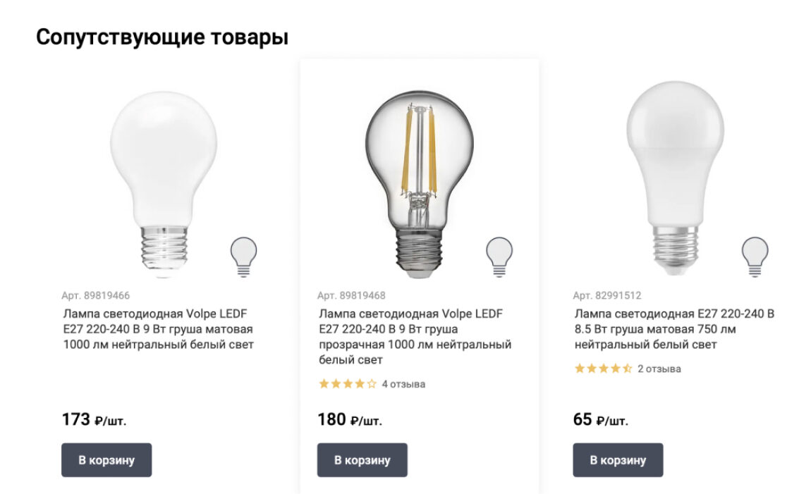 Пример перекрёстных продаж в интернет-магазине: при выборе торшера предлагаются лампочки для этой модели