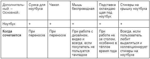 2. Сделайте матрицу кросс-продаж — сопоставите продукты по сочетаемости и выберите те, которые дополняют друг друга. Обозначьте, в каком случае товары применяются вместе. Удобно сделать матрицу в виде таблицы.