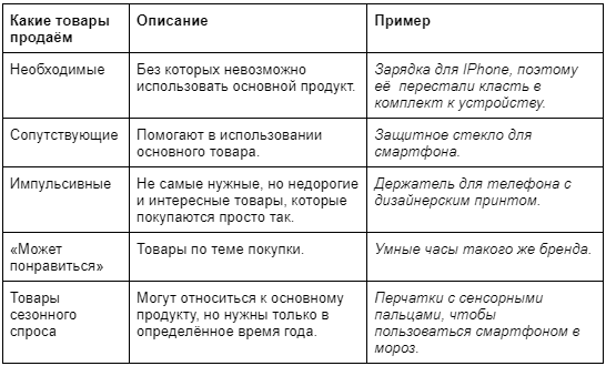 5. Продумайте офферы для предложения сопутствующих продуктов. Например, «с этим товаром покупают» (социальное доказательство) или «не забудьте приобрести», если это продукты, которые пригодятся для эффективного использования основного.