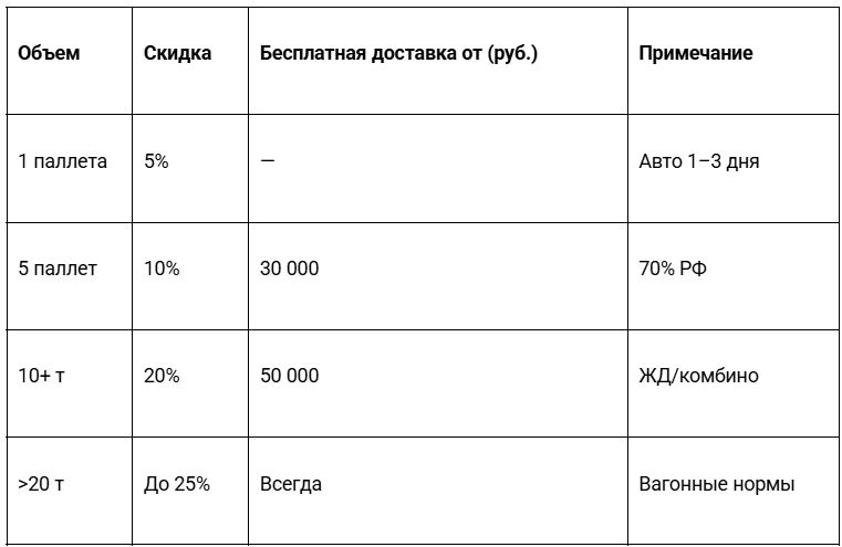 Условия: Опт/розница от 10 000 руб. для скидок, B2B через сайт/менеджера, НДС, доставка ТК.