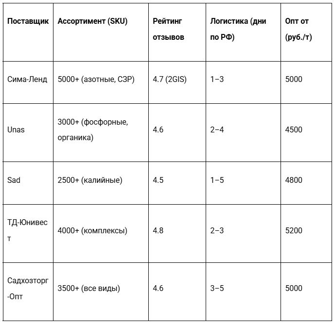 Крупнейшие поставщики объединяют продукцию химической промышленности: азотные, фосфорные удобрения и калийные (включая хлористый калий) от ведущих российских компаний вроде Уралхим и Акрон. По отзывам, лидерами дистрибуции стали Сима-Ленд, Unas, Sad, ТД-Юнивест и Садхозторг-Опт — одним из крупнейших в РФ по ассортименту для сельского хозяйства.