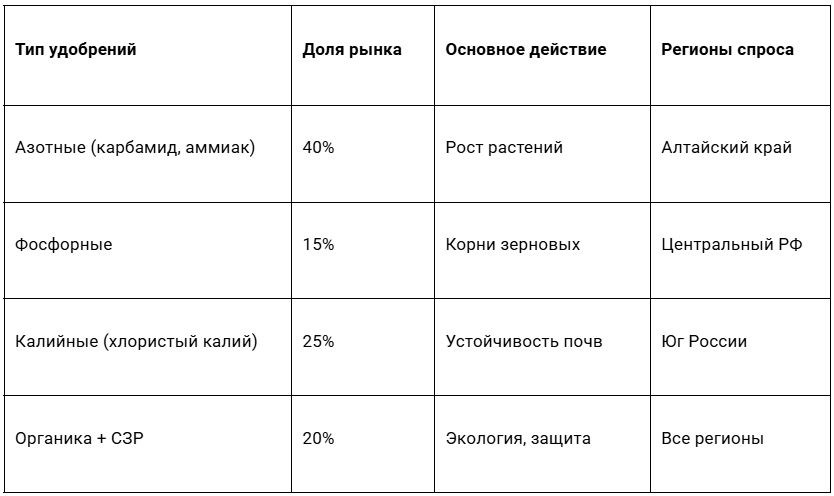 Азотные удобрения, такие как карбамид и аммиак, лидируют на рынке минеральных удобрений в России, обеспечивая до 40% общего объема благодаря высокому содержанию азота — ключевого питательного вещества для роста растений. Фосфорные удобрения поддерживают развитие корневой системы зерновых культур, особенно востребованных в Алтайском крае, где по данным редакции сосредоточены крупнейшие потребители. Калийные удобрения, включая хлористый калий, составляют около 25% рынка, повышая устойчивость почв к засухам и болезням; вместе они занимают до 80% продаж среди российских компаний.
