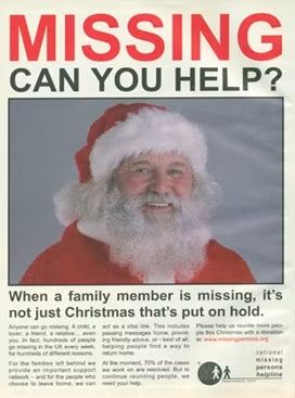 Еще одна нетипичная рождественская кампания — родом из 2000-х. В 2004 году горячая линия помощи родственникам пропавших без вести (National missing persons helpline) решила, что в Рождество неплохо бы напомнить о своем существовании. Служба разместила объявление о пропаже Санта-Клауса с призывом всем, кто его видел, звонить на ее телефон.