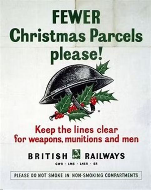Другая предновогодняя кампания — из 1940-х от государственного перевозчика Британские железные дороги (British railways, BR). Во время второй мировой войны большая часть ресурсов страны — человеческих, промышленных и экономических — была направлена на военные цели. Вместо звучавших ранее призывов больше путешествовать на поездах BR в тот раз железнодорожники призывали граждан не путешествовать вообще и сократить отправку рождественских подарков в другие города.