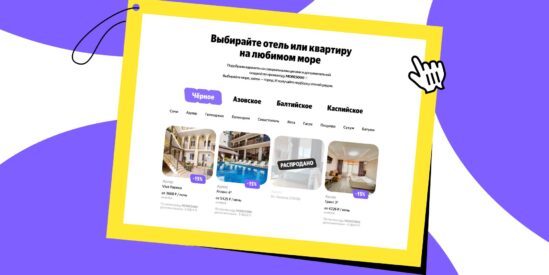 В рекламной кампании «На четыре моря» собрали отели на Черном, Азовском, Балтийском и Каспийском морях — популярных направлениях для летнего отдыха в России. Подборку разместили на лендинге и дополнили оффером со скидками и промокод на 5 тысяч при заказе от 60 тысяч рублей.