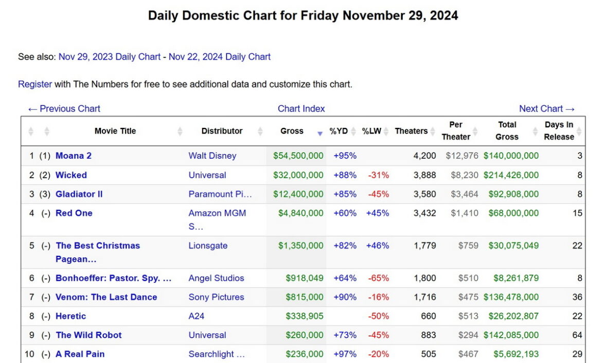По данным The Numbers, мультфильм «Моана-2» занял 29 ноября первое место по кассовым сборам в США, собрав $54,5 млн. Он оттеснил на второе место «Злую», которая в этот день собрала $32 млн. Третьим был «Гладиатор» с $12,4 млн.