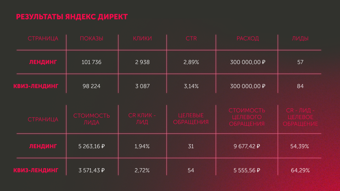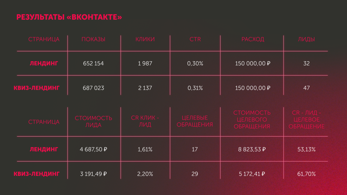 лендинг, другая — на квиз-лендинг. При этом размер бюджета, креативы и настройки контекстной рекламы были одинаковыми. Таким образом мы создали