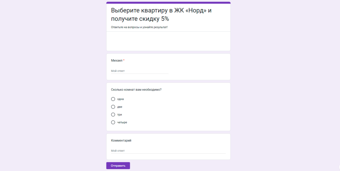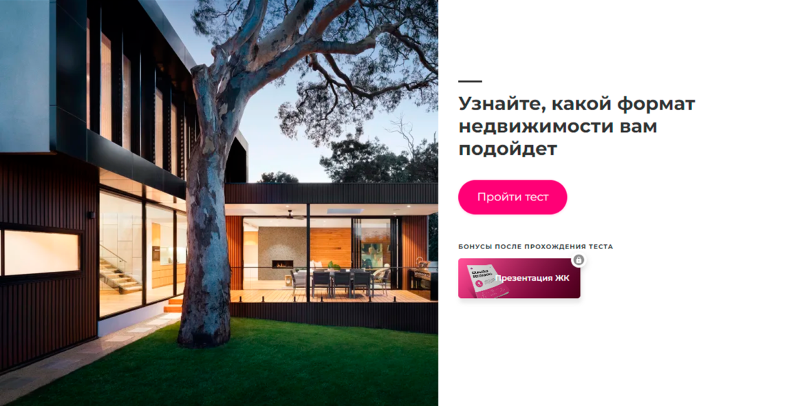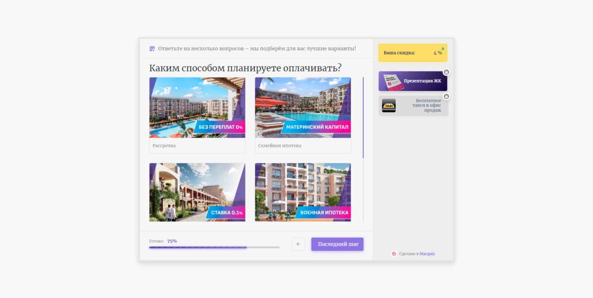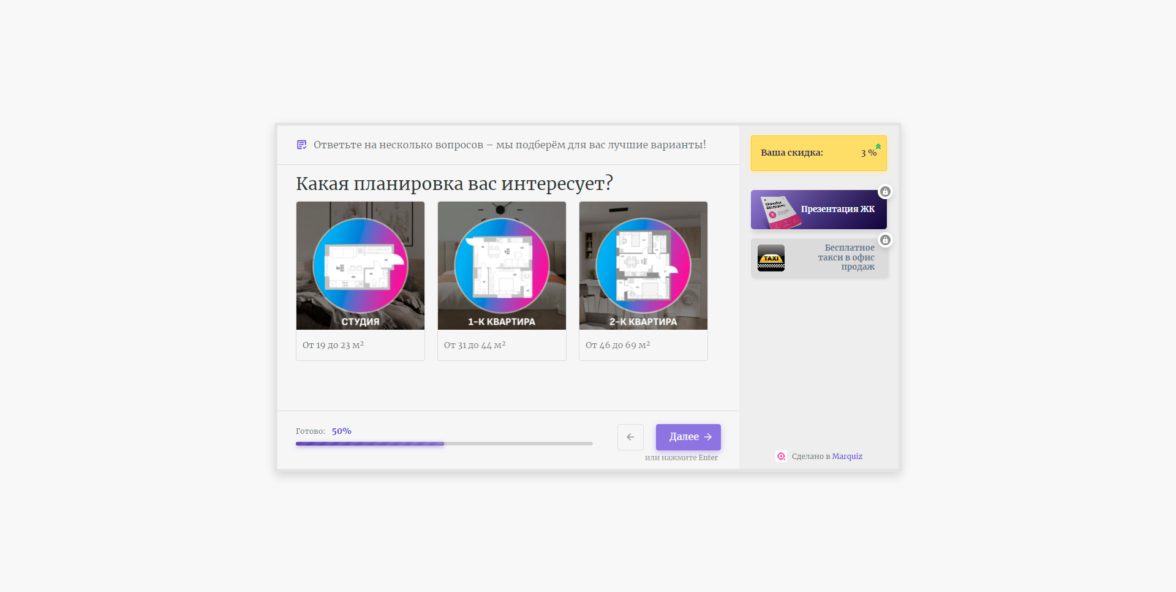 Онлайн-опросник помогает пользователю лучше понять свои потребности и облегчить ему процесс выбора. Маркетологам формат квиза позволяет охватить тех, кто еще не сформировал критерии выбора объекта, но все-таки запланировал покупку недвижимости в будущем.