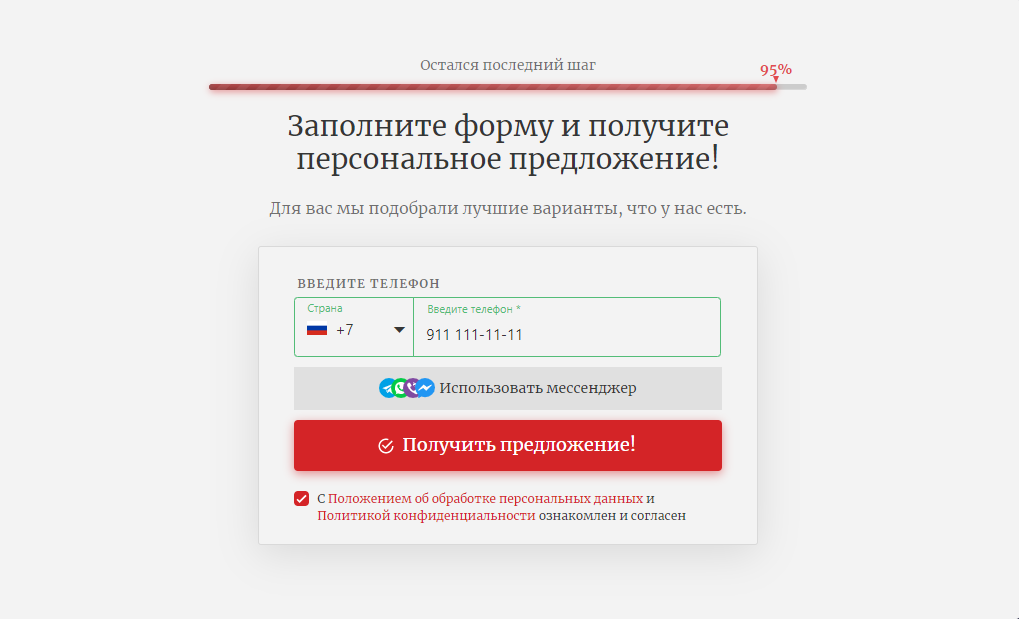 5. Удобная форма обратной связи. Успех квиза во многом зависит от грамотного оформления последнего шага. Наиболее конверсионным является подход, когда для получения результата квиза, нужно отправить контактные данные. Предложите пользователю заполнить легкую лид-форму с обязательным полем «Номер телефона» и необязательным — «Почта», куда можно отправить бонусное предложение. Строку «Имя» смело можете исключить. Специалист call-центра всегда уточнит, как можно обращаться к клиенту, во время звонка. Из актуального: люди в последнее время предпочитают использовать мессенджеры для получения любой информации. Поэтому стоит также добавить кнопки Telegram и WhatsApp для обратной связи.
