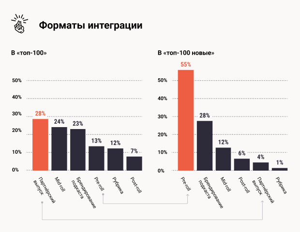 Чаще всего в подкастах размещали рекламу финансовых услуг (15,7% в «Топ-100» и 50,3% в «Топ-100 новые»), а также услуг в системе образования и трудоустройства (10,9% и 18,1% соответственно). Почти всегда авторы давали ссылку на бренд в описании выпуска: у шоу из «Топ-100» это присутствовало в 92% случаев, а у новых подкастов — в 76%.