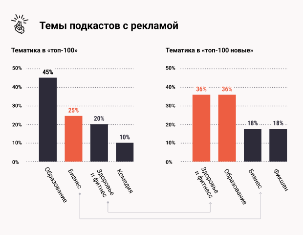 За первый квартал 2022 года в подкастах из «Топ-100» вышло 1 277 выпусков, в «Топ-100 новые» — 527. В процентном соотношении реклама чаще встречалась в последних: 34% (199 выпусков) против 18% (229 выпусков). Популярные форматы в обеих категориях — разговорный и монолог, а темы — образование, бизнес и здоровье.