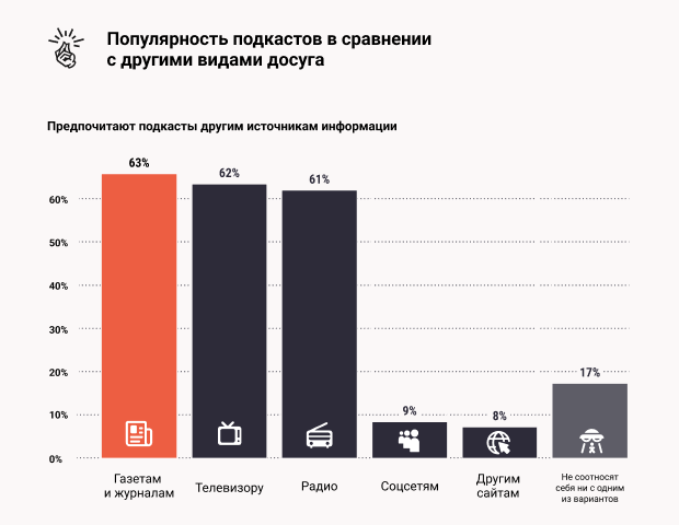 За прошедший год ровно половина респондентов стала слушать подкасты чаще. 42% включают их несколько раз в неделю. Шоу в основном сопровождают аудиторию в дороге (39%), во время выполнения дел по дому (23%) или отдыха (13%). Кроме того, для многих подкасты — предпочитаемый источник информации: слушатели нечасто обращаются к другим средствам медиа.