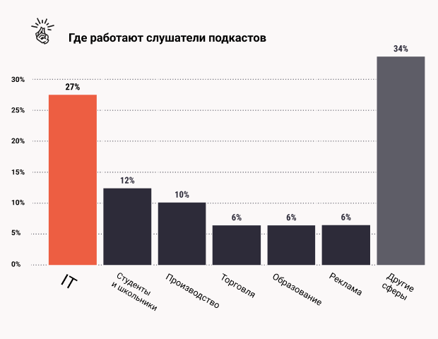 Согласно опросу, основу аудитории подкастов составляют люди в возрасте от 18 до 34 лет (76%). 57% из них мужчины, 43% — женщины. На графике можно увидеть, в каких сферах работают слушатели.