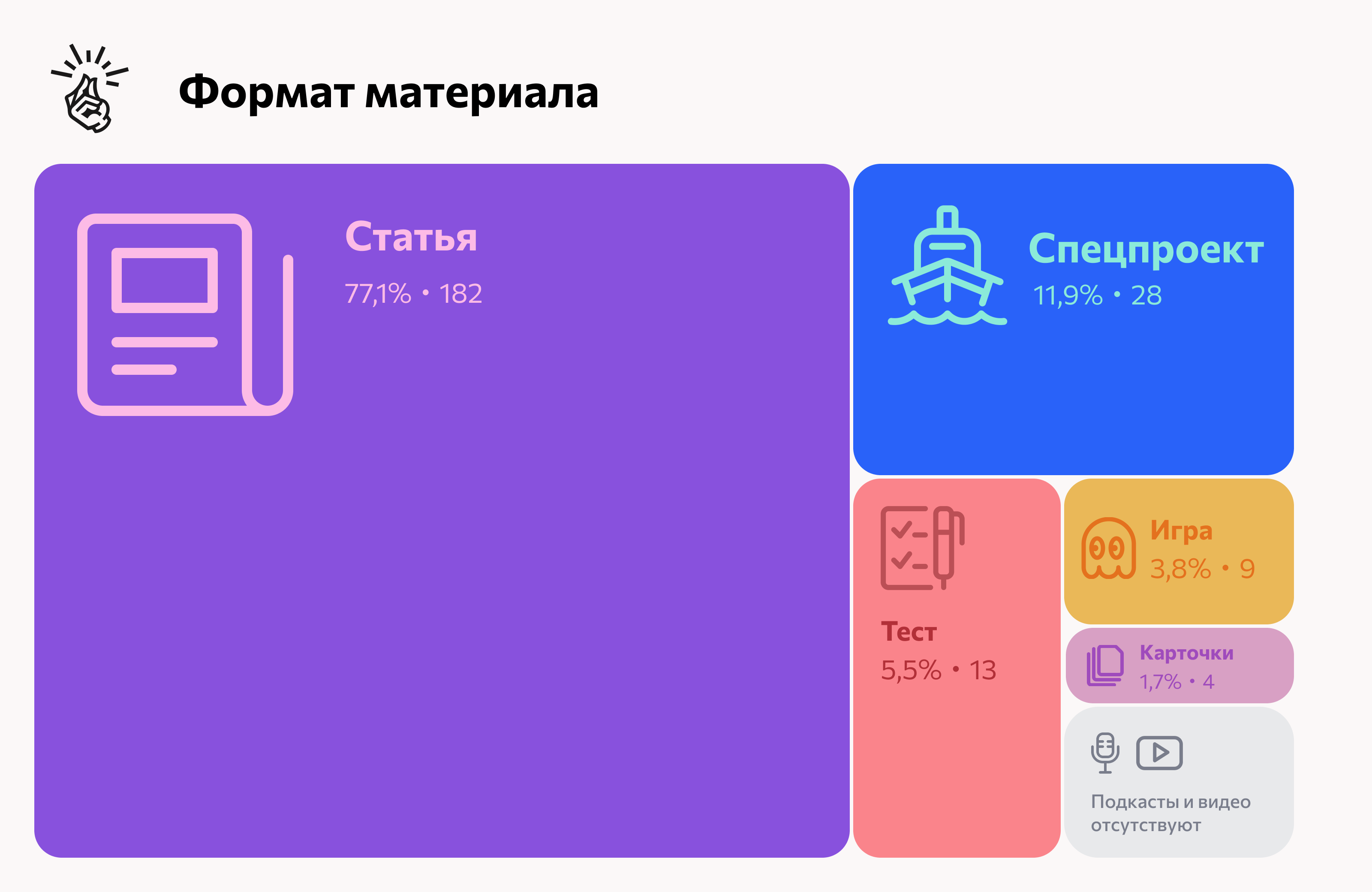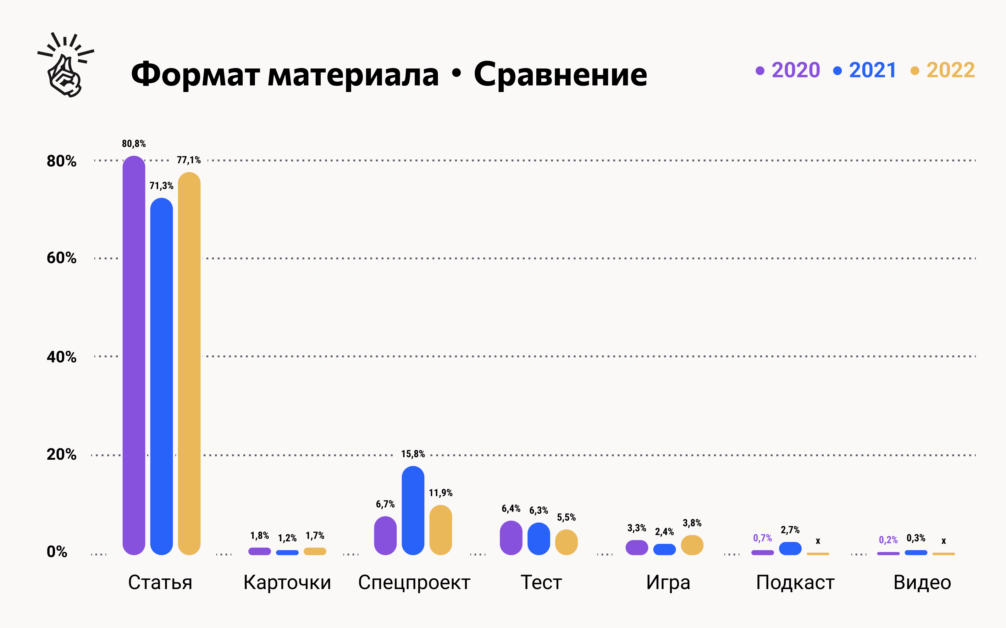 Самым востребованным форматом по-прежнему остаются статьи. На их долю пришлось 77% всех размещений. По сравнению с 2021 годом популярность статей даже выросла. «Карточки» держатся на одном и том же минимальном уровне третий год подряд. Число спецпроектов сократилось с 15,8 до 11,9%, тестов — с 6,3 до 5,5%. Единственным сложным форматом, который показал небольшой рост, стали игры. Партнёрских подкастов и видео в этом году исследователи не обнаружили.