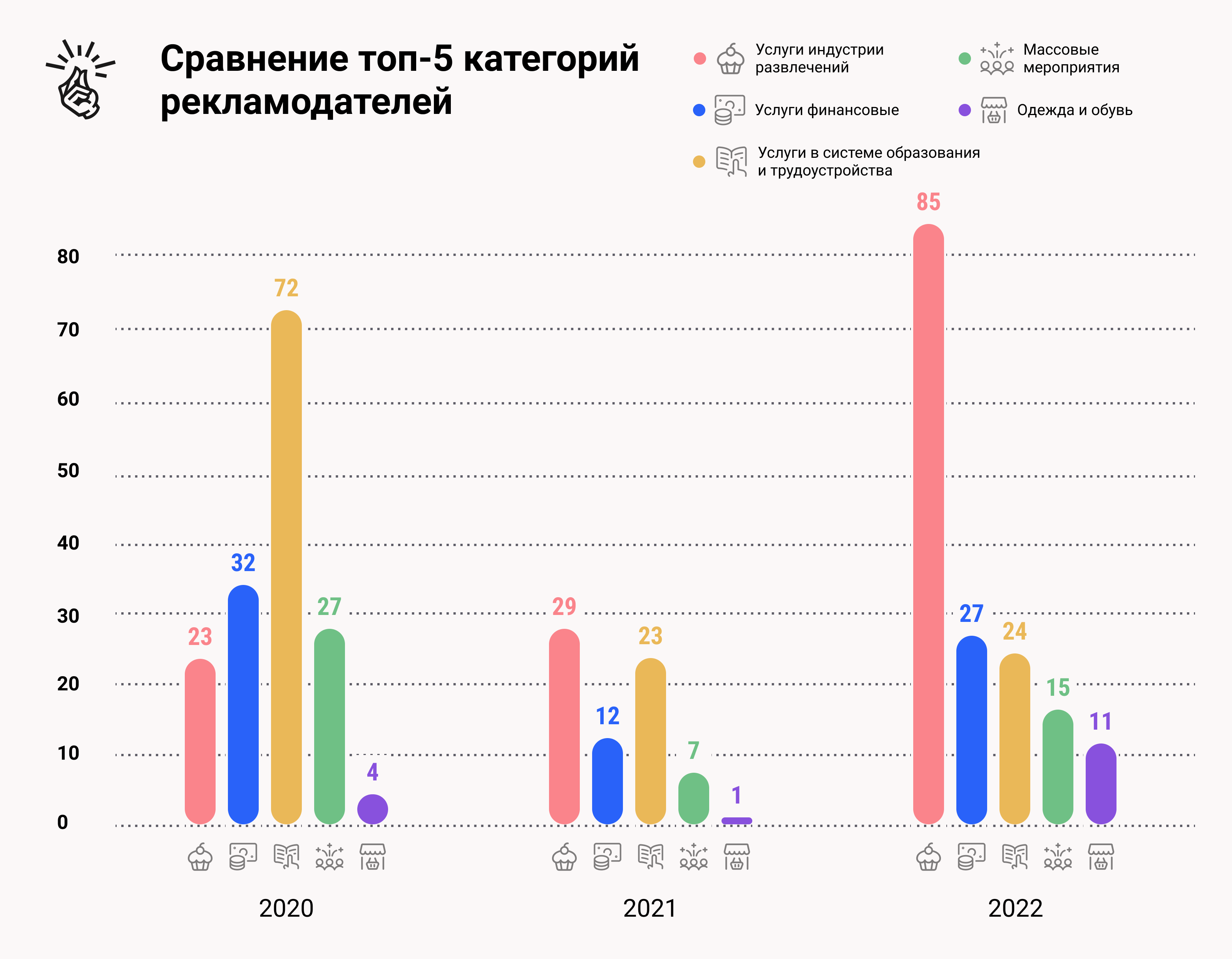Любопытно наблюдать, как из года в год меняются топовые категории рекламируемых товаров и услуг. Сейчас на первом месте — внимание! — услуги в индустрии развлечений, а год назад они не вошли даже в пятёрку. В тройке лидеров финансы и образование — тут всё стабильно. Мы видим этот интерес и по своим курсам Pikabu Study: спрос на новые навыки и профессии растёт.