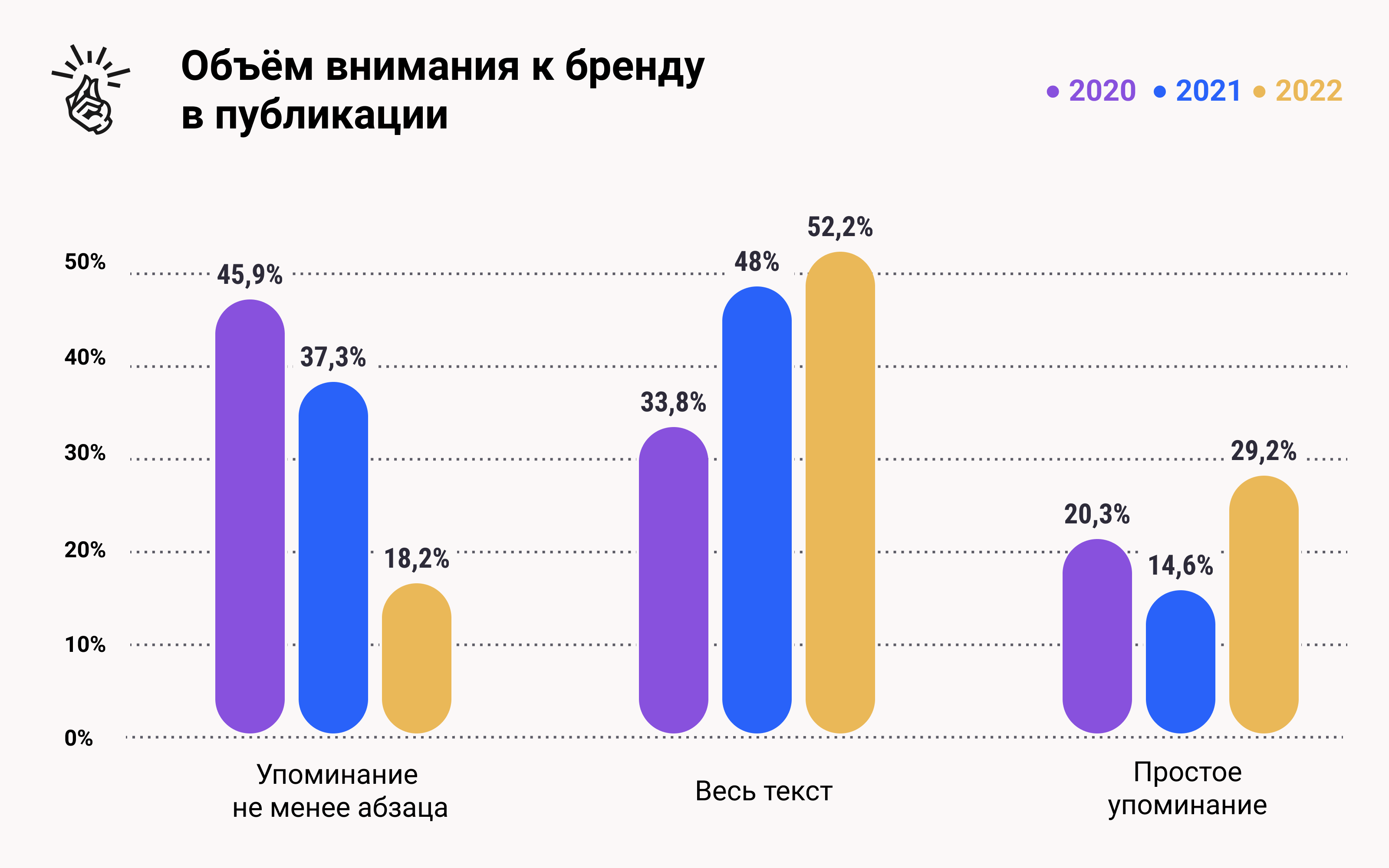 Интерес бизнеса к текстам, в которых бренд упоминается не менее одного абзаца, в 2022 году упал на 19,1%. А количество материалов, полностью посвящённых рекламодателю, напротив, выросло на 4,2%. Публикаций, содержащих минимальное упоминание о рекламодателе, в этом году тоже стало больше — 29% против 14,6% в 2021-ом.