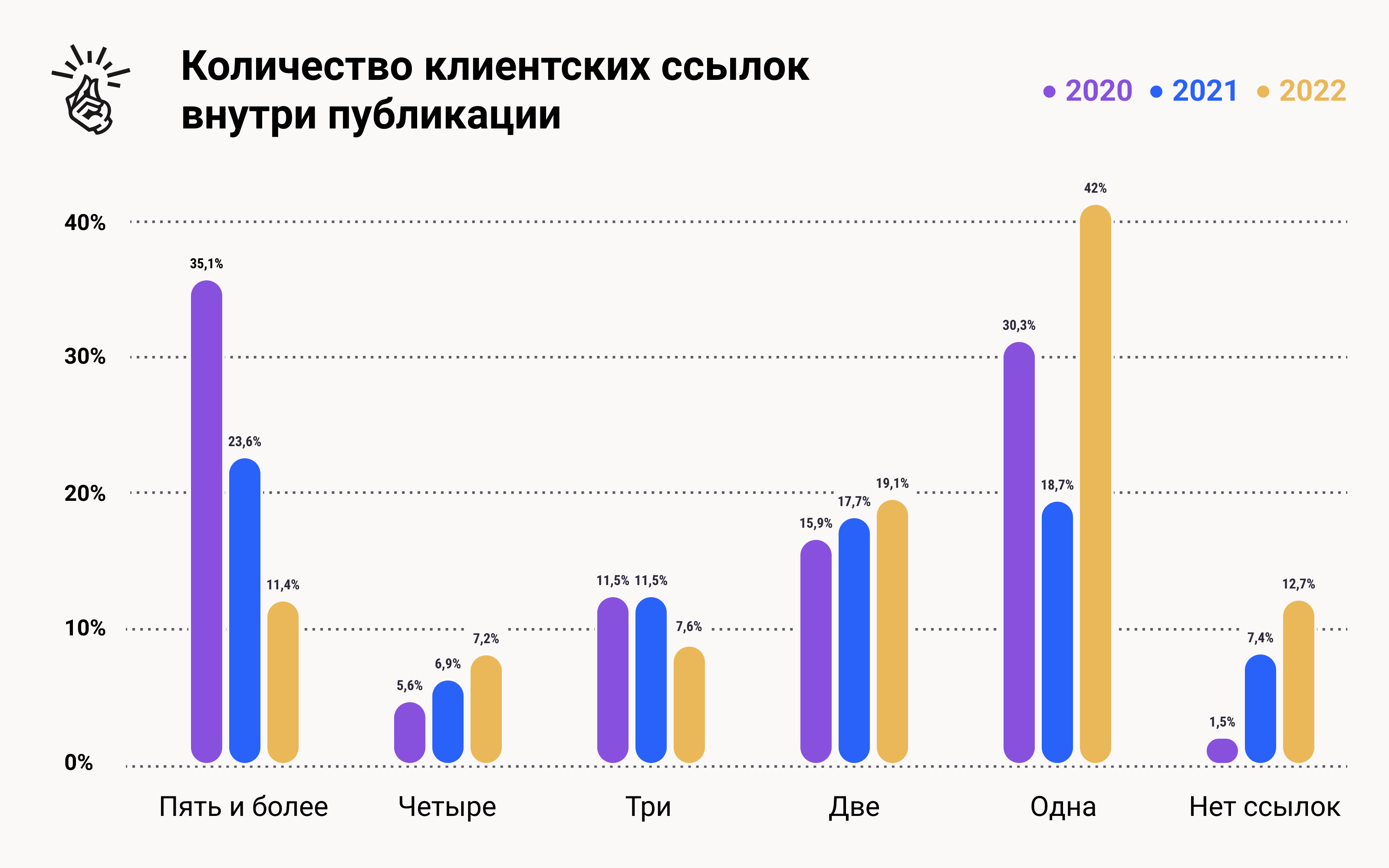 При этом исследователи обнаружили закономерность: в последние годы количество ссылок на рекламодателя в материалах изданий снижается. В 2022-м в 42% публикаций была всего одна ссылка на сайт клиента, в 19% — две, в 12,7% ссылок вообще не оказалось. То же самое происходит в соцсетях. В 66% публикаций встречается не более двух ссылок на рекламодателя, а в 27% ссылки вообще отсутствуют.