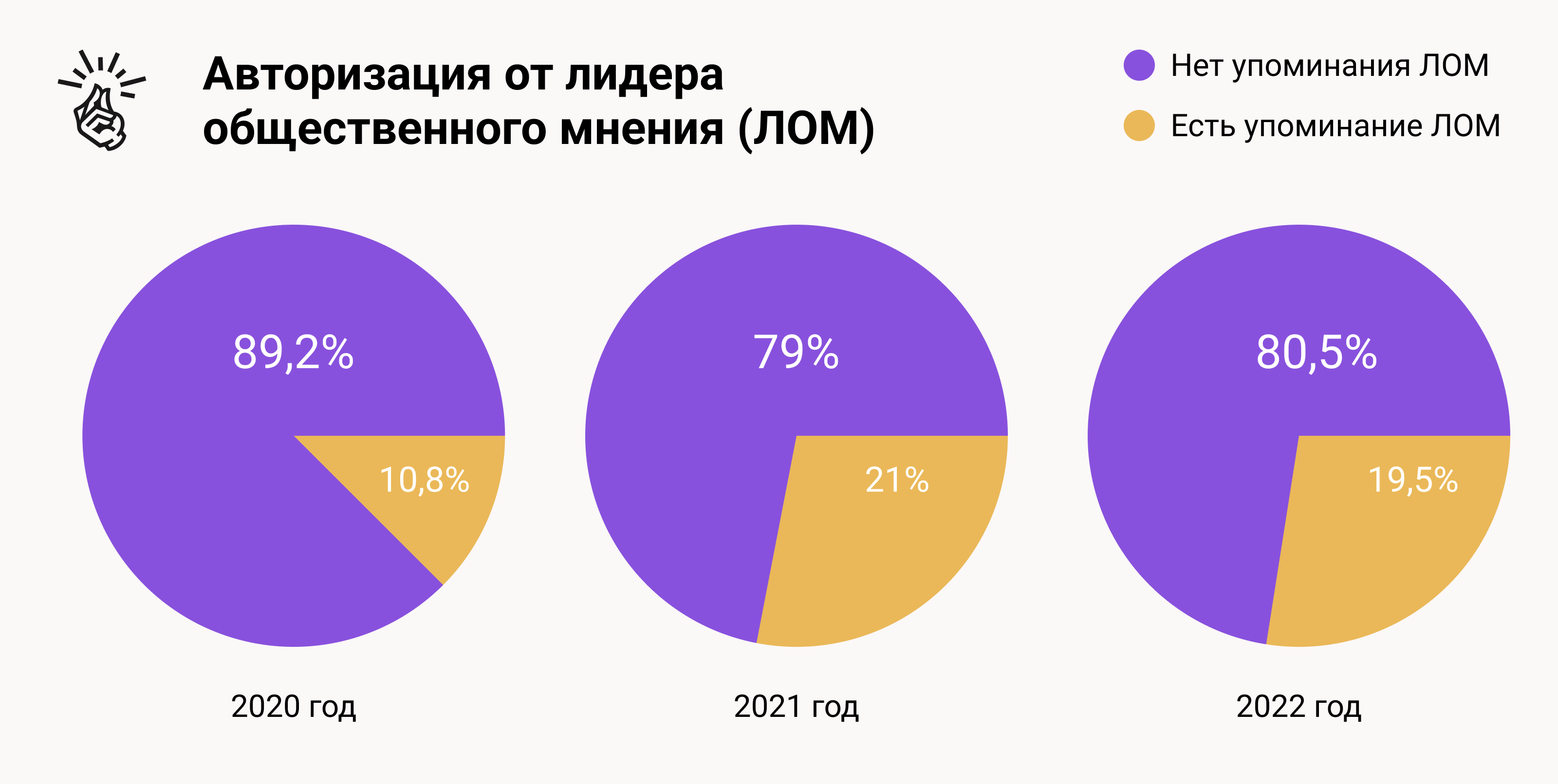 Три года назад «Лайфхакер» дополнил исследование параметром «Авторизация от лидера общественного мнения (ЛОМ)». Он показывает, как часто в рекламных кампаниях медиа выстраивают коммуникацию на основе мнения знаменитостей, блогеров или экспертов. За всё время процент упоминаний медийных лиц особо не меняется. Из этого можно сделать вывод: медиа и бренды по большей части не привлекают инфлюенсеров к нативному продвижению.