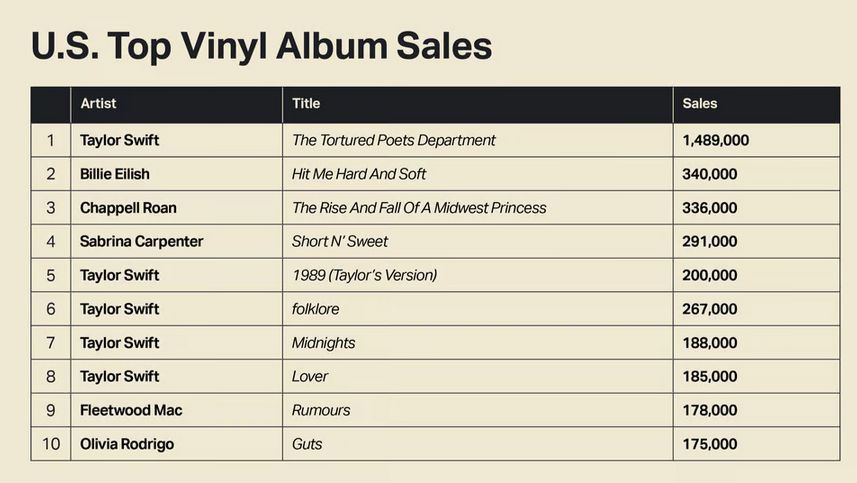 В топ-3 самых продаваемых альбомов на виниле вошли The Tortured Poets Department Тейлор Свифт (1,5 млн копий), Билли Айлиш «Hit me hard and soft» (340 тыс.) и «The Rise And Fall Of A Midwest Princess» от Чаппелл Рон (336 тыс.).