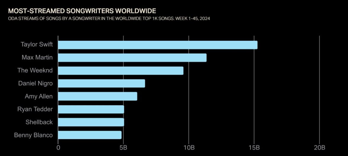 Самым популярным композитором и исполнителем в мире в 2024 году стала американская дива Тейлор Свифт. Ее песни прослушали более 16 млрд раз. На втором месте — швед Макс Мартин (около 13 млрд), на третьем — канадский певец The Weeknd (9,5 млрд).