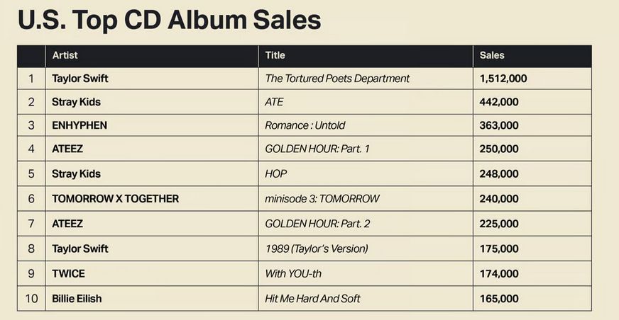 Самым популярным музыкальным направлением на компакт-дисках в 2024 году стал К-поп. Семь из десяти К-поп альбомов вошли в топ-10 по продажам в США в 2024 году. Самые успешные — Stray Kids — второе место с альбомом «ATE», который разошелся тиражом 442 тыс. экземпляров и пятое с «HOP» (248 тыс.). Также в топе Enhypen «Romance: Untold», Ateez с альбомами «Golden Hour: Part. 1» и «Golden Hour: Part. 2» и альбом Tomorrow X Together «minisode 3: Tomorrow».