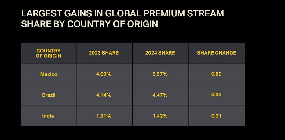 Несмотря на то, что исполнители из США пока являются самыми популярными в аудиостриминге с долей 45%, она сокращается (на 0,44 п.п. в 2024 году). Находящиеся на второй строчке британцы также теряют позиции (-0,47 п.п. до 8,6%). У них появляются сильные конкуренты из других стран: доля мексиканских исполнителей выросла на 0,88 п.п. до 4,7%, бразильских — на 0,33 п.п. до 4,5%, индийских — на 0,21 п.п. до 1,4%.
