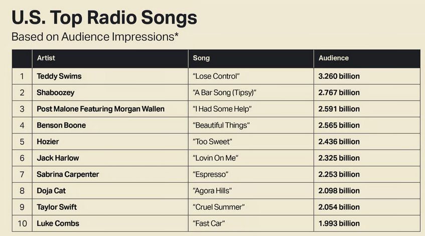 Самой популярной песней на радио была песня Тедди Свимса Lose Control (общая аудитория, прослушавшая композицию за год, составила 3,2 млрд человек). В тройке также Шэбузи с A Bar Song (2,7 млрд) и Post Malone при участии Моргана Уоллена с композицией I had some help (2,6 млрд).