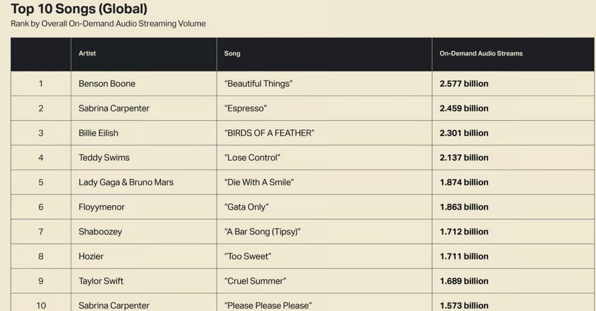 Тем не менее первое место по прослушиваниям в мире в 2024 году заняла не композиция Тейлор Свифт, а песня другого американского музыканта, Бенсона Буна Beautiful Things. Ее прослушали 2,5 млрд раз. На втором месте американская актриса и певица Сабрина Карпентер с композицией Espresso (2,45 млрд), на третьем — Билли Айлиш и Birds of a feather (2,3 млрд).