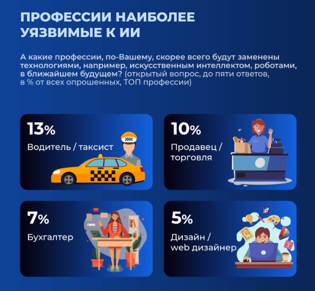 На вопрос о том, в каких профессиях в будущем человека смогут заменить технологии искусственного интеллекта и роботы, больше всего ответивших назвали профессию таксиста — 13%. На втором месте в списке профессий, которые могут вымереть — продавцы, работники торговли — 10%. На третьем — бухгалтера — 7%, на четвертом — дизайнеры и web-дизайнеры — 5%.