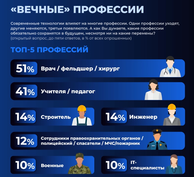 Абсолютными лидерами стали представители медицинских специальностей (врач, фельдшер, хирург). За них прогосовало чуть более половины опрошенных (51%). На втором месте — учителя — 41%. Третье поделили строители и инженеры (по 14%). Пятое — военные и IT-специалисты (по 10%). Интересен список профессий, получивших по 2% голосов: руководящие профессии/управленец, парикмахер, уборщик (клининг), токарь, пилот, техник, экономист, бухгалтер, художник. При этом отдельно от «руководящих профессий/управленцев» подсчитаны голоса за следующий список: «Депутат/губернатор/министр/мэр /правительство/президент/чиновник/госслужащий». В будущее представителей этих категорий верит уже не 2%, а 5% респондентов.