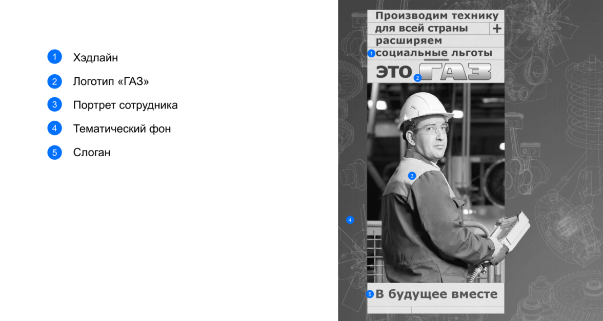 Кроме обязательного наглядного блока для каждого типа профессий, создали адресное вербальное послание — то, что важно услышать именно этим людям. А для широкого понимания роли компании на рынке и того, что она может дать сотруднику, использовали формулировки по схеме 1+1= ГАЗ: