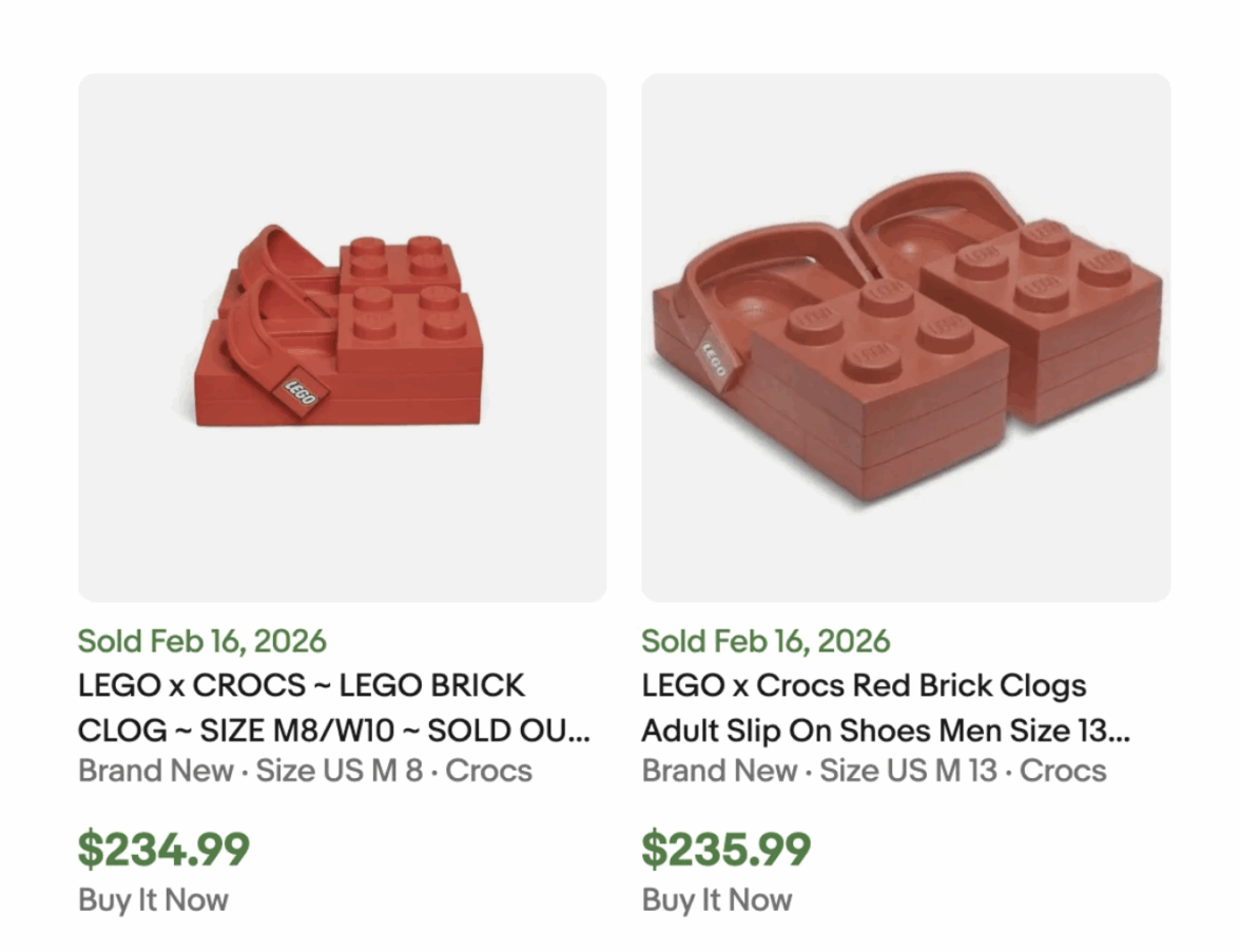 Многолетнее креативное партнерство, о котором объявили в январе 2026 года культовый производитель детских конструкторов Lego и не менее культовый производитель обуви из полимерного материала крослит Crocs, дало первые плоды. Сабо в форме кубиков Lego были полностью распроданы в течение нескольких часов после дропа.
