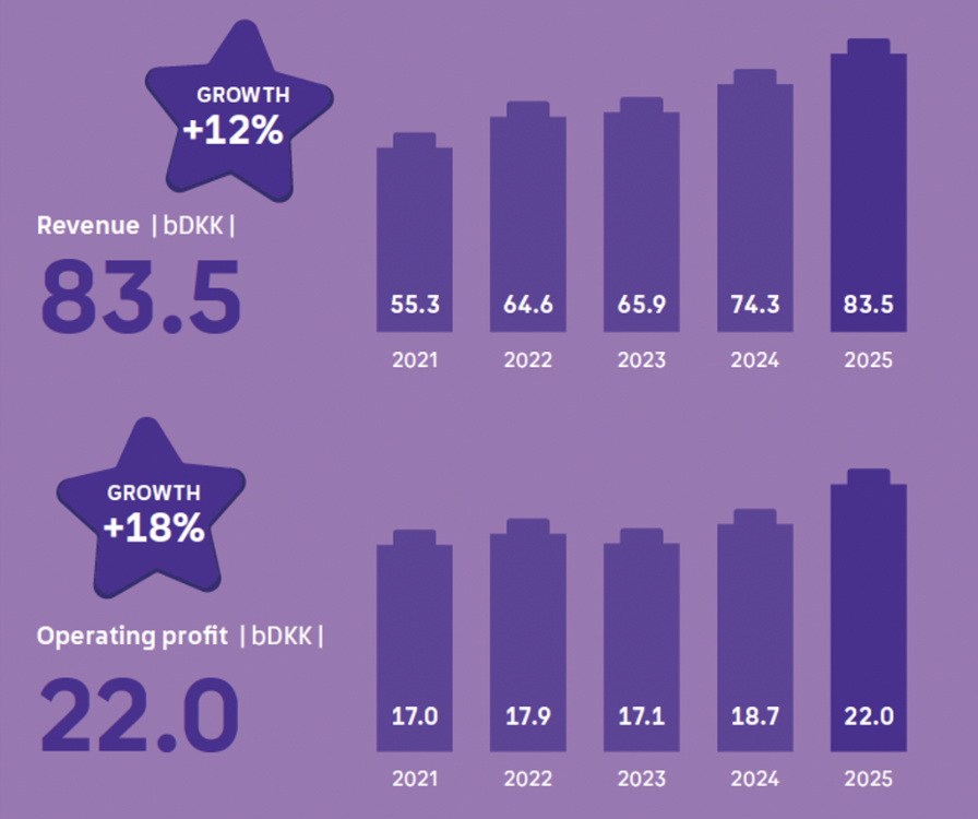 Выручка (сверху) и операционная прибыль Lego Group в 2021–2025 годах, в датских кронах. Внутри зведочек (сверху вниз) — показатели роста в 2025 году.