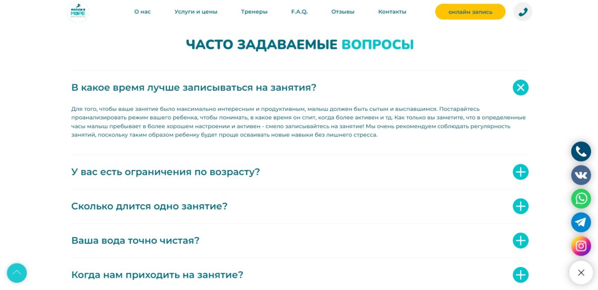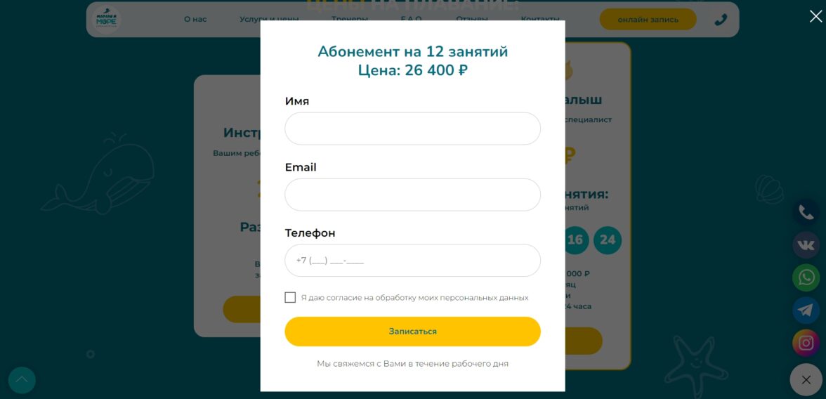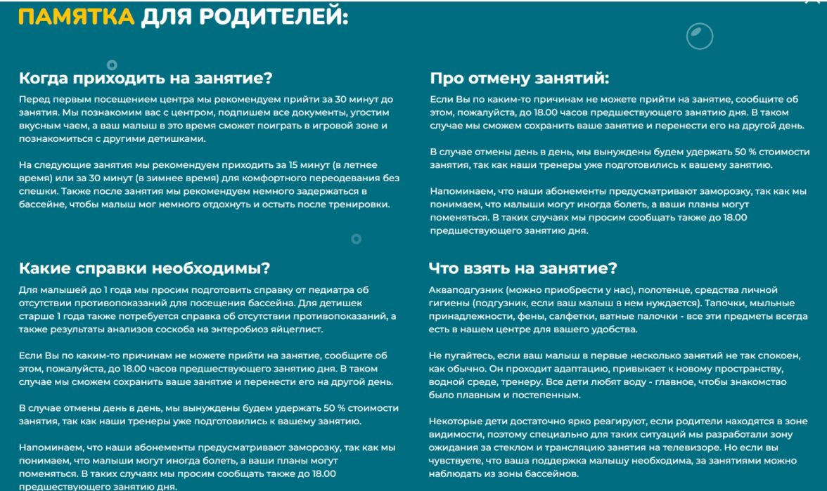 «Малыш и Море» — это центр раннего плавания для детей от 3 месяцев до 6 лет. Услуги клиента на начальном этапе открытия представляют грудничковое плавание и общеоздоровительные занятия по плаванию в ценовом сегменте выше среднего. Отличительным преимуществом является удобная самостоятельная запись, большие бассейны и привлекательный сайт по сравнению с конкурентами. Все УТП были полноценно раскрыты на данном веб-ресурсе.