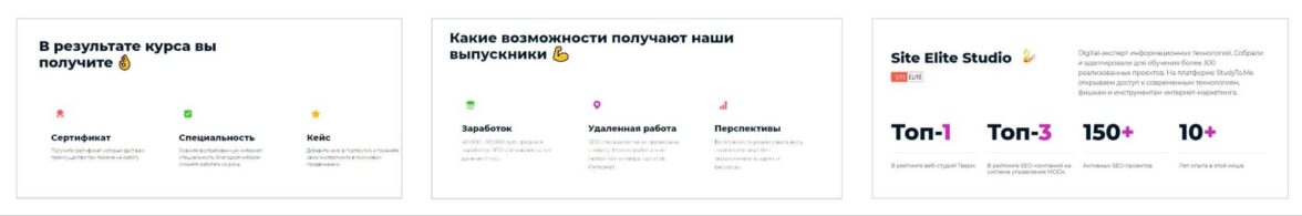«Вижу заголовок — понимаю суть товарного предложения — листаю — убеждаюсь, что мне нужен товар или услуга — записываюсь на мероприятие, делаю заказ или оставляю контакты». Так выглядит пользовательский путь на типовой, грамотно выполненной посадочной странице. Смысловой вектор здесь единый для всех блоков (экранов сайта), поэтому вероятность, что пользователь сделает заказ, максимальна.