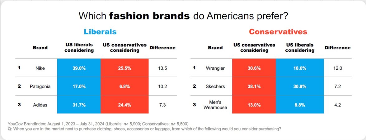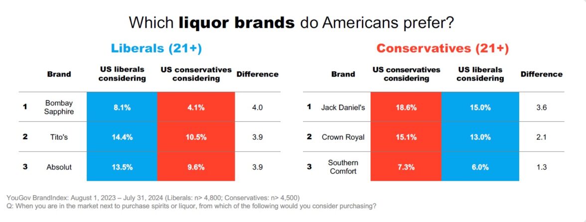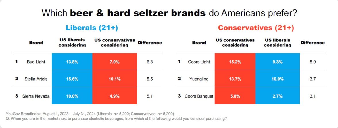 Решив выпить пива, либерал, достигший 21-летнего возраста, в первую очередь будет рассматривать Bud Light (бренд, потерпевший миллиардные убытки из-за рекламы с трансгендером Диланом Малвани), Stella Artois и Sierra Nevada. У консерваторов в пивном рейтинге лидируют Coors Light, Coors Banquet и Yuengling. Компания Molson Coors, владеющая двумя из трех названных брендов, только что сделала еще один шаг навстречу своей целевой аудитории: она объявила, что отказывается от поддержки нелюбимых консерваторами программ DEI (разнообразие, равенство, инклюзия).