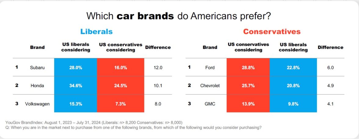 При будущей покупке автомобиля большинство либералов будут рассматривать в первую очередь «японца» или «немца» – Subaru, Honda и Volkswagen. Консерваторы в вопросе покупки авто поступят патриотично, предпочтя отечественную продукцию, – Ford, Chevrolet и GMC (второй и третий бренд принадлежат General Motors).