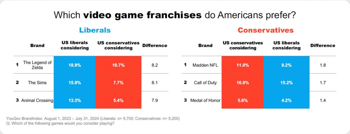 Если либерал решит играть в компьютерную игру, он предпочтет спасать принцессу в Legend of Zelda, устраивать виртуальную семейную жизнь героев Sims или общаться с антропоморфными соседями по деревне в Animal Crossing. Консерваторам больше по душе американский футбол (Madden NFL) и шутеры Call of Duty и Medal of Honor.