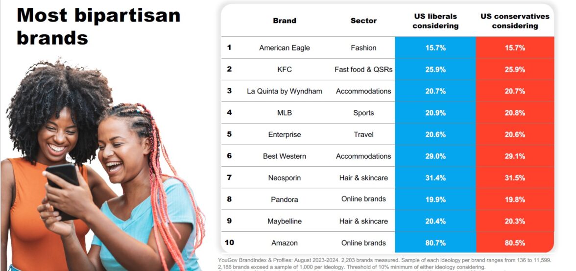 В ходе исследования YouGov выяснилось, что всего лишь 29% американских брендов более или менее устраивают представителей обеих соперничающих идеологий. За них отдали голоса как минимум 10% либералов и 10% консерваторов. Посмотрим на чемпионов.