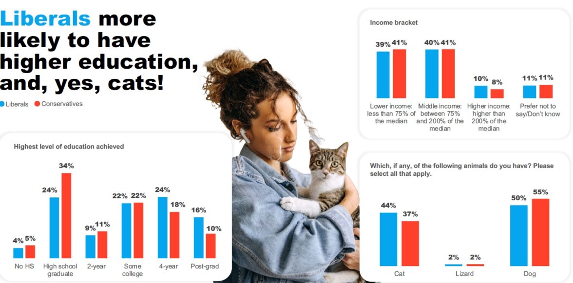 С помощью отдельного опроса YouGov выяснила политические взгляды 360 000 жителей США. Выяснилось, что по идеологическому признаку опрошенные делятся так: радикальные либералы (11,6%), либералы (17%(), умеренные (32,5%), консерваторы (16,8%), радикальные консерваторы (8,5%), а также не имеющие определенных убеждений (13,7%).
