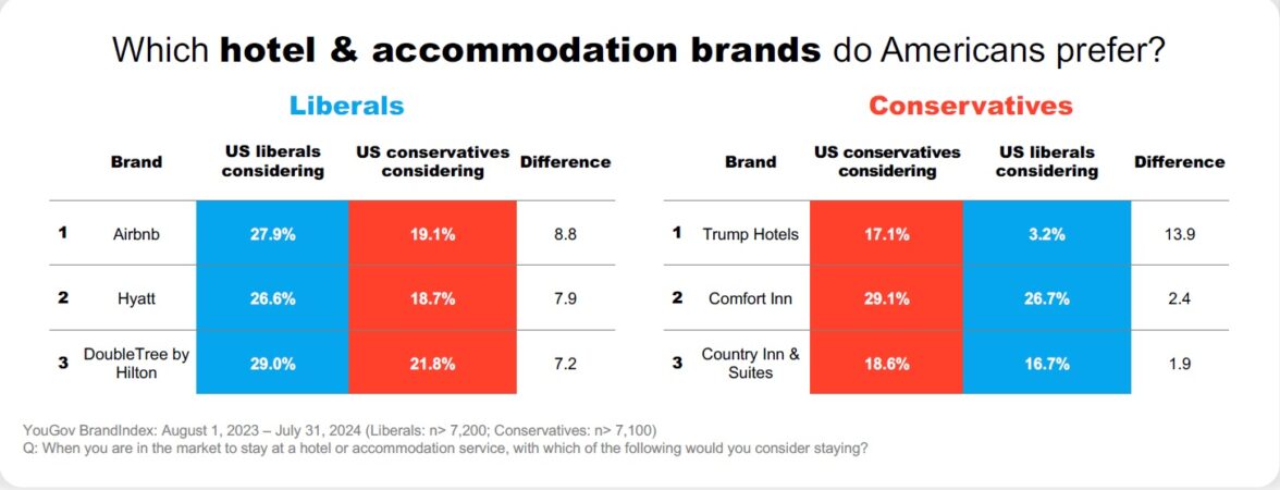 В путешествиях либералов больше всего привлекает возможность снять комнату или дом через Airbnb. Консерваторы выбирают гостиничную сеть Trump Hotels. 17,1% консерваторов готовы в следующей поездке поселиться в отеле, носящем имя главного консерватора США. Среди либералов лишь 3,2% согласны жить в столь токсичном месте.