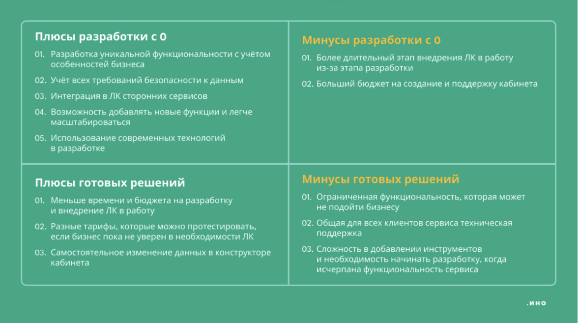 У разработки ЛК с нуля и у готовых решений есть свои плюсы и минусы, поэтому каждая компания выбирает свой вариант