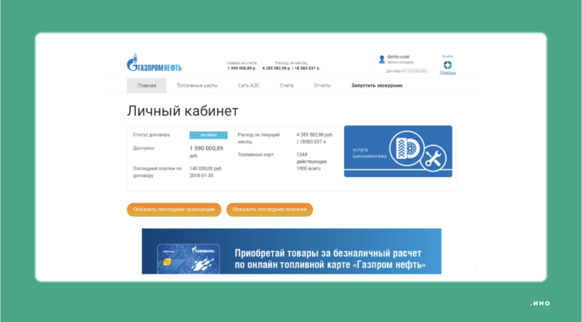 В личном кабинете портала «Газпромнефть» бизнес может передать показания или посмотреть последние транзакции