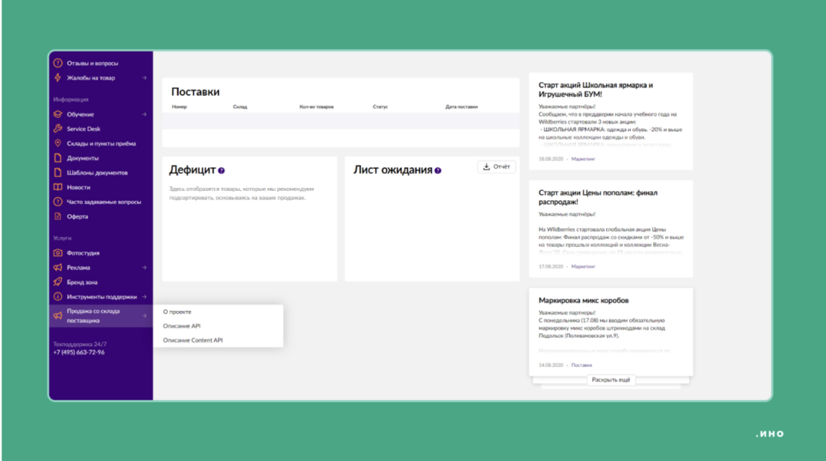 Маркетплейсы: в ЛК для поставщиков хранится информация об отгрузках, остатках на складе, история оплат и форма для прикрепления копий сопроводительных документов.