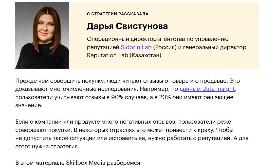 Дарья Свистунова рассказывала Skillbox Media о стратегии управления репутацией
